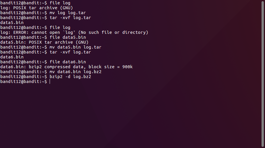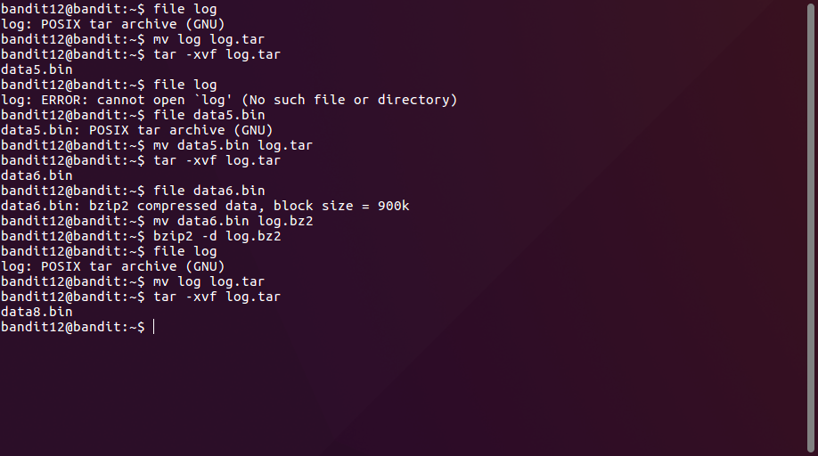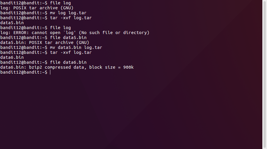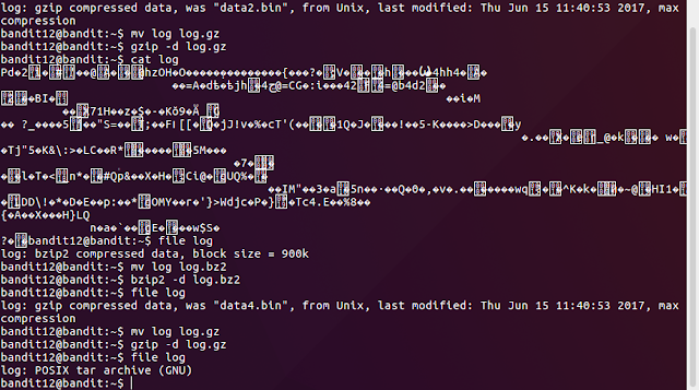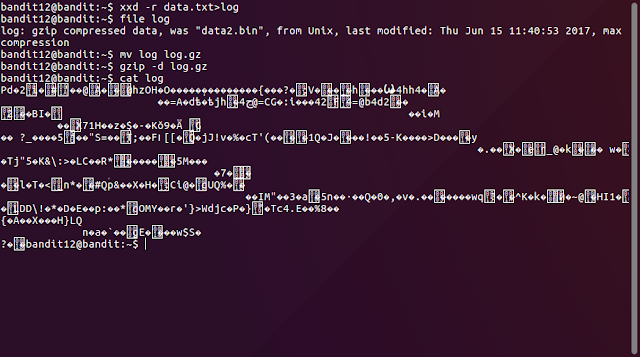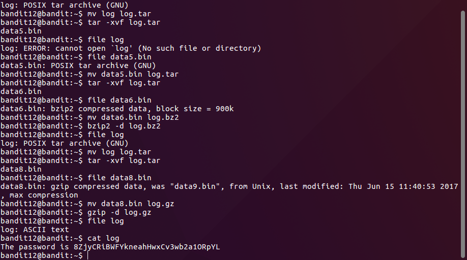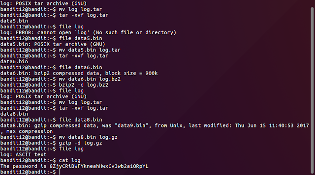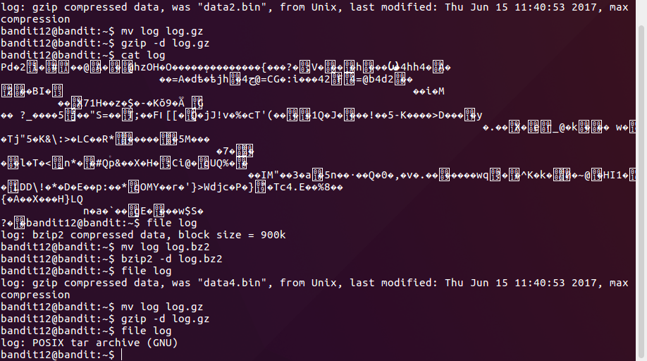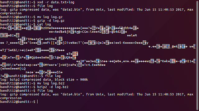 다음 레벨의 암호는 반복적으로 압축 된 파일의 16 진수 덤프 인 data.txt 파일에 저장됩니다. 이 수준에서는 /tmp 아래에 mkdir을 사용하여 작업 할 수 있는 디렉토리를 만드는 것이 유용할 수 있습니다.