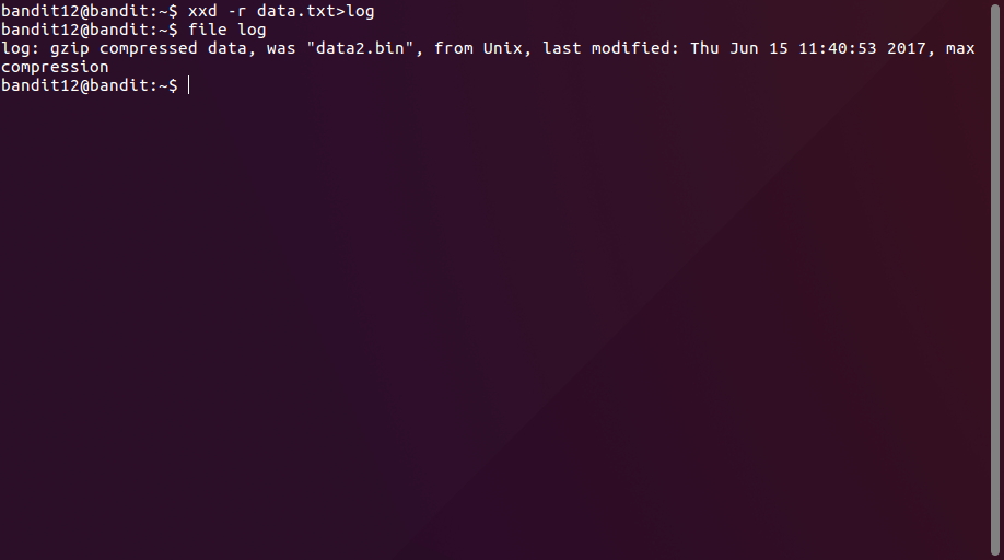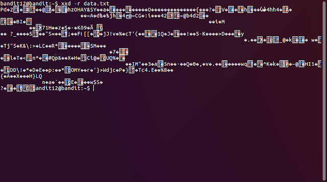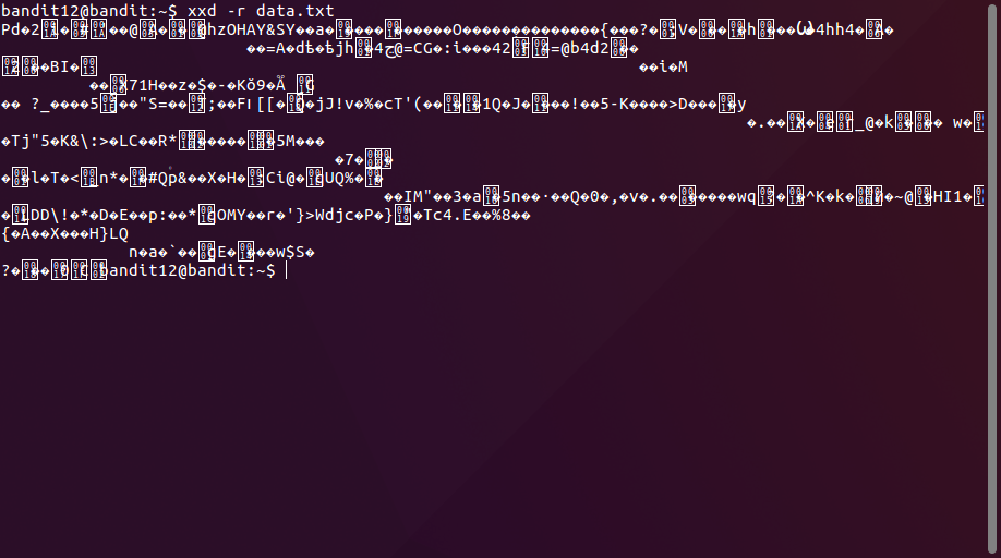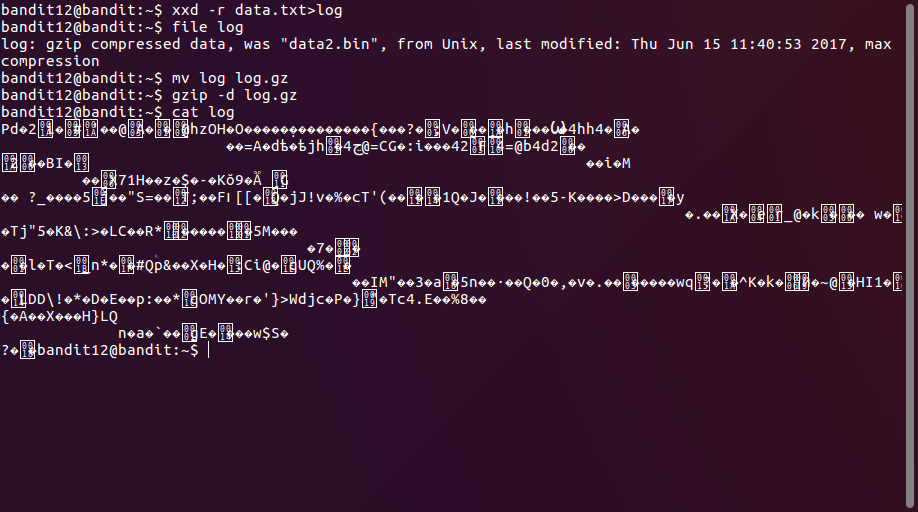 The password for the next level is stored in the file data.txt, which is a hexdump of a file that has been repeatedly compressed. For this level it may be useful to create a directory under /tmp in which you can work using mkdir. For example: mkdir /tmp/myname123. Then copy the datafile using cp, and rename it using mv (read the manpages!)