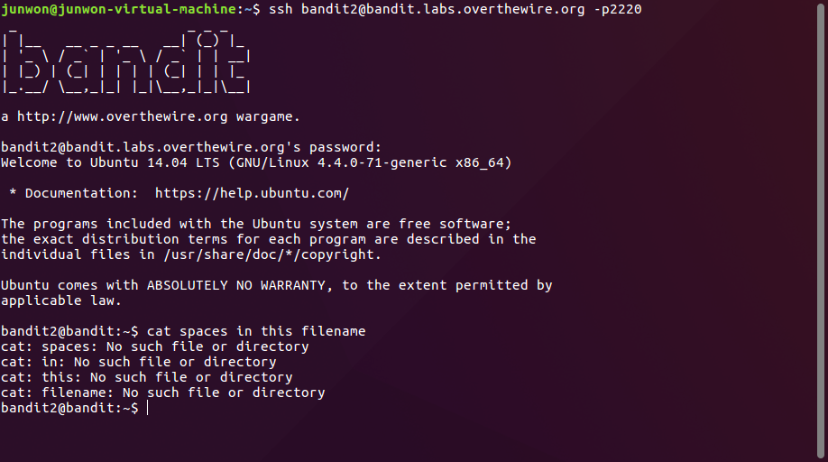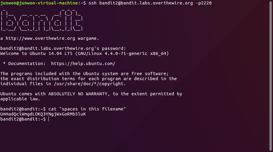 ssh에 접속한 후 cat 명령어를 사용하여 파일의 내용물을 확인하면 된다. 하지만 이 파일이름에는 공백이 포함되어있으므로