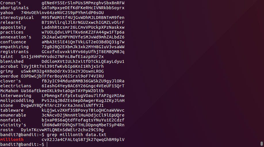 The password for the next level is stored in the file data.txt next to the word millionth